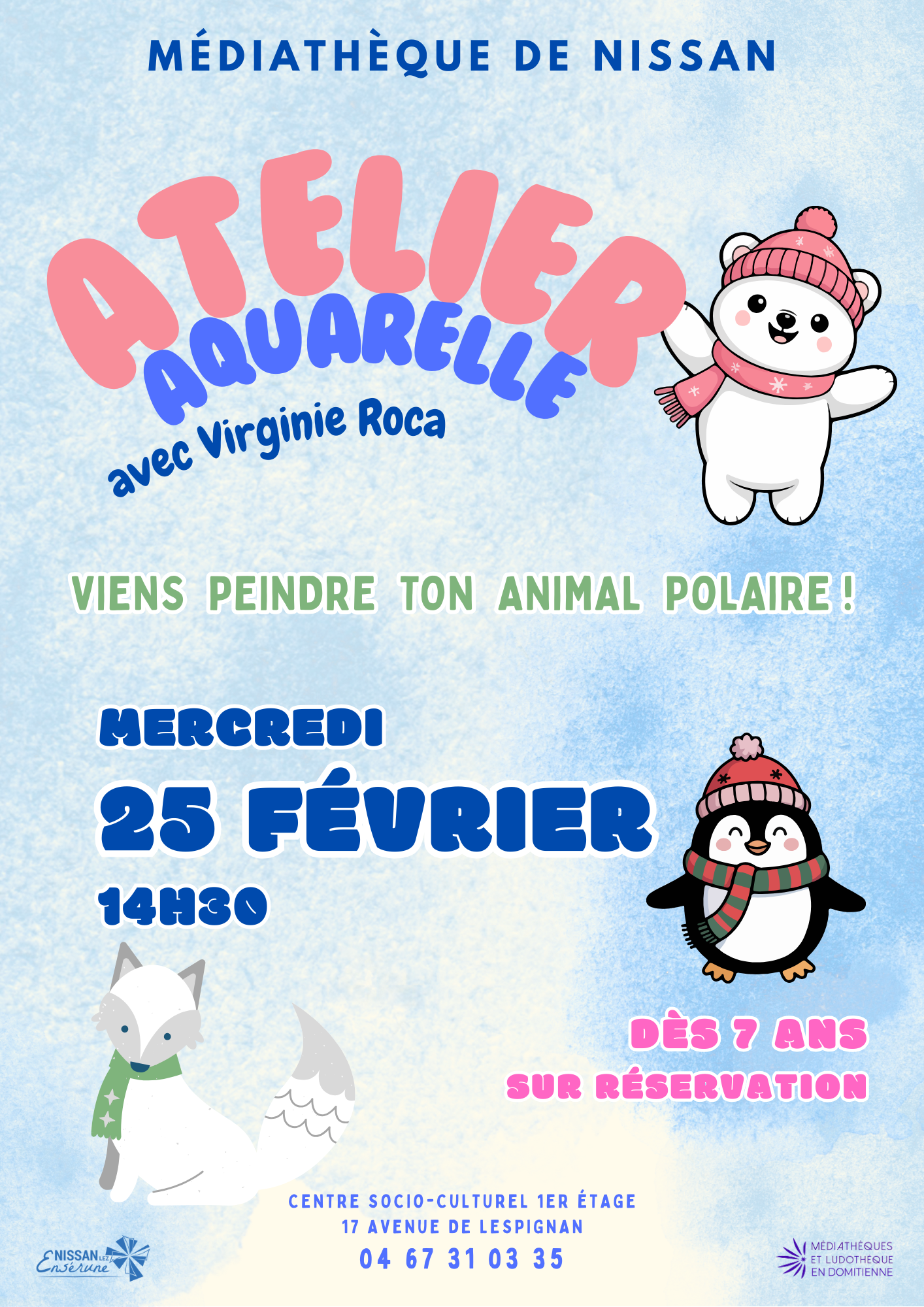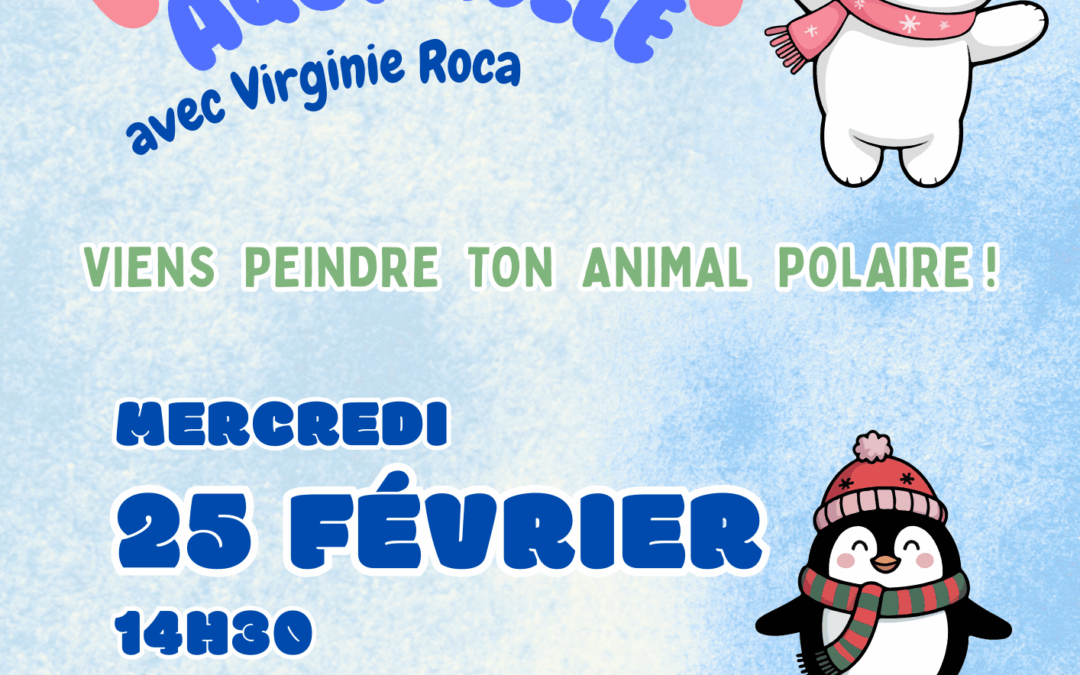 Atelier aquarelle » Viens peindre ton animal polaire » avec Virginie Roca Jan 22, 2026 Atelier aquarelle » Viens peindre ton animal polaire » avec Virginie Roca 20 20 people viewed this event. S’inscrire à l’évènement Pour s’inscrire à cet évènement, Veuillez vous rendre à l’URL suivante : → Date et heure 2026-02-25 à 2026-02-25 Lieu Médiathèque Partager avec des amis Facebook Twitter Linkedin Xing Pinterest