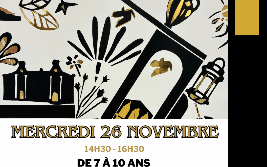 Atelier de pratique artistique avec l’artiste Majéon: Tracer, découper, révéler Oct 27, 2025 Atelier de pratique artistique avec l’artiste Majéon: Tracer, découper, révéler 22 22 people viewed this event. S’inscrire à l’évènement Pour s’inscrire à cet évènement, Veuillez vous rendre à l’URL suivante : → Date et heure 2025-11-26 à 2025-11-26 Lieu Médiathèque Partager avec des amis Facebook Twitter Linkedin Xing Pinterest