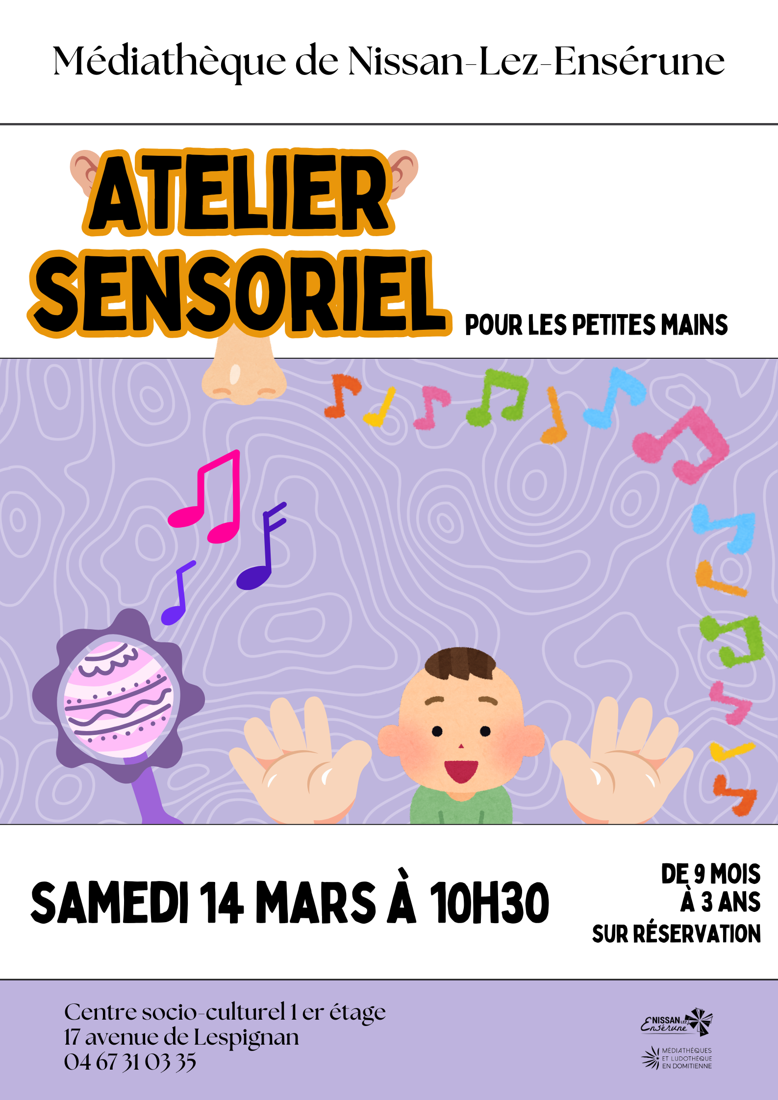 Atelier sensoriel pour les petites mains Fév 18, 2026 Atelier sensoriel pour les petites mains 93 93 people viewed this event. S’inscrire à l’évènement Pour s’inscrire à cet évènement, Veuillez vous rendre à l’URL suivante : → Date et heure 2026-03-14 à 2026-03-14 Lieu Médiathèque Partager avec des amis Facebook Twitter Linkedin Xing Pinterest