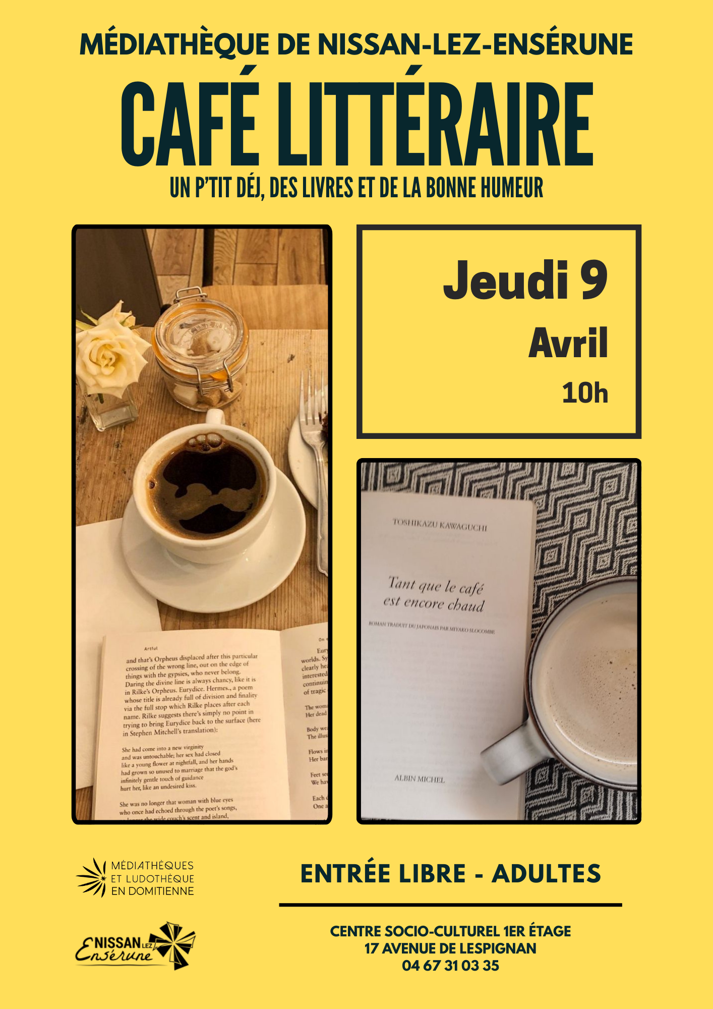 Café littéraire Mar 11, 2026 Café littéraire 32 32 people viewed this event. S’inscrire à l’évènement Pour s’inscrire à cet évènement, Veuillez vous rendre à l’URL suivante : → Date et heure 2026-04-09 à 2026-04-09 Lieu Médiathèque Partager avec des amis Facebook Twitter Linkedin Xing Pinterest