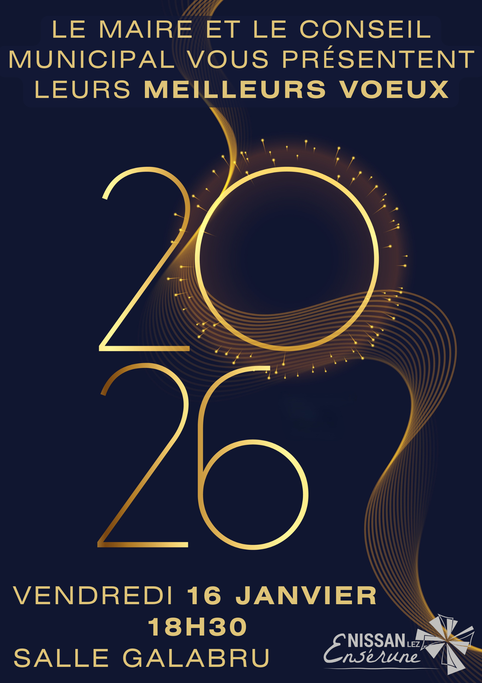Le maire et le Conseil Municipal de Nissan-Lez-Ensérune seraient honorés de votre présence à la cérémonie de présentation des vœux pour la nouvelle année 📅 Vendredi 16 janvier 2026 🕕 18h30 📍 Salle Michel Galabru